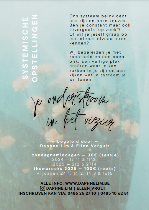Je onderstroom aka je systeem wil je iets tonen, wil aanschouwd worden. Met een systemische blik richten we ons op het thema dat jij aanbrengt. Misschien sta je niet op je juiste plek of is er iemand die niet gezien werd in je systeem.